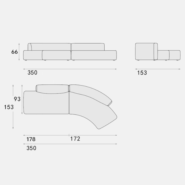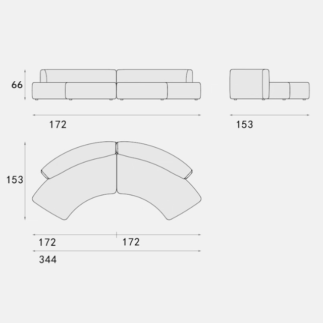 - Dimensions: 344cm x 153/93cm x 66cm(WxDxH) – Circular version